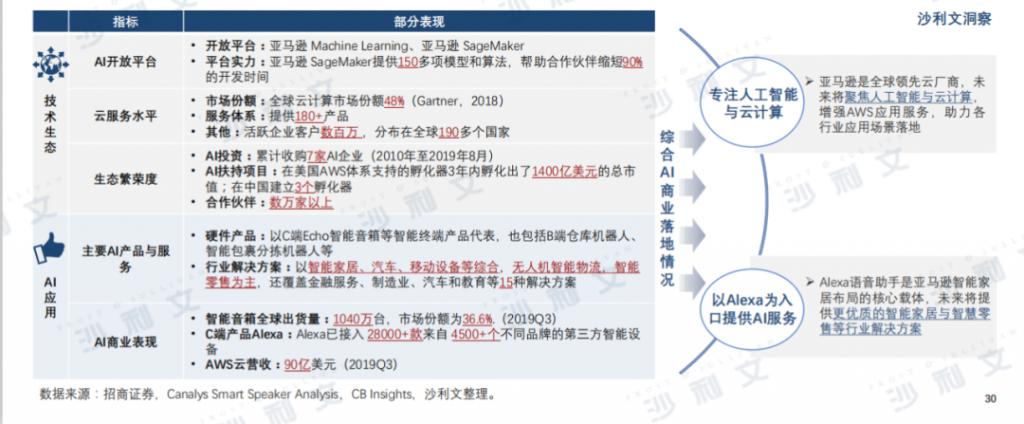 亚马逊在生态建设上以云计算为核心,以Alexa为AI服务入口,对内外赋能,未来将专注人工智能云,促使AWS应用服务更加全面、智能化。