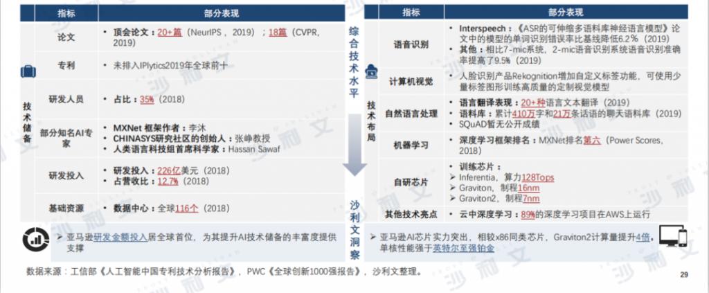 亚马逊的研发投入居全球首位,为AI技术储备奠定较好基础;在AI技术布局方面,AI芯片技术实力突出,具有较强的竞争优势。
