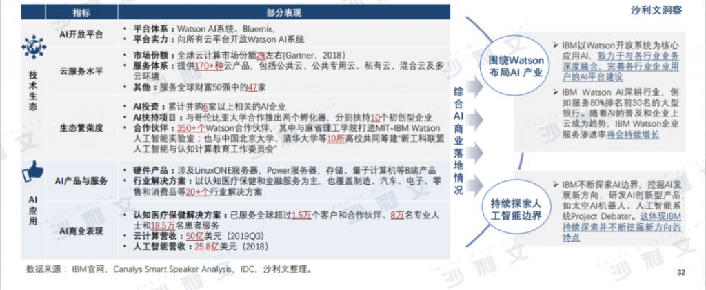 IBM是人工智能发展的先驱,得益于自身软件积累和基础科学研究,AI技术储备较为完备,并围绕Watson全面布局AI技术。