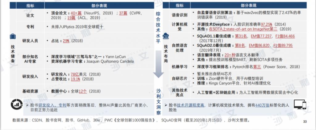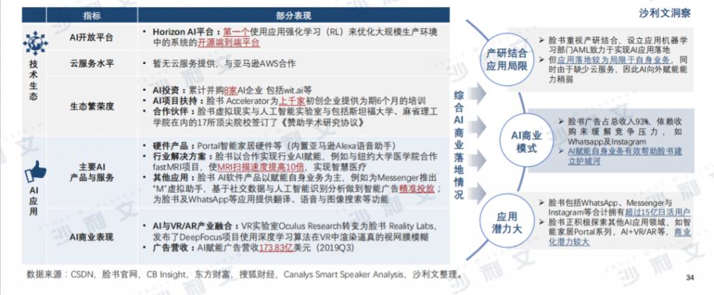 Facebook由于云服务的缺失,较其他美国厂商在生态上稍显不足,但AI赋能自身业务程度较高,且数据积累较多,AI应用落地潜力大。