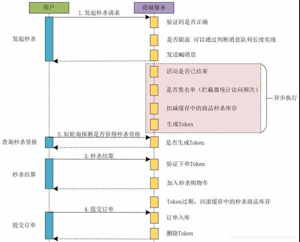 用户发起秒杀请求后,商城服务会经过如下业务流程。