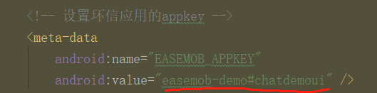 2.其次怎么使用环信的appkey ,可以在环信 console 后台注册一个 账号申请appkey ,可以参考这里 ,获取到 appkey 以后添加到AndroidManifest.xml中 ,如下图所示: