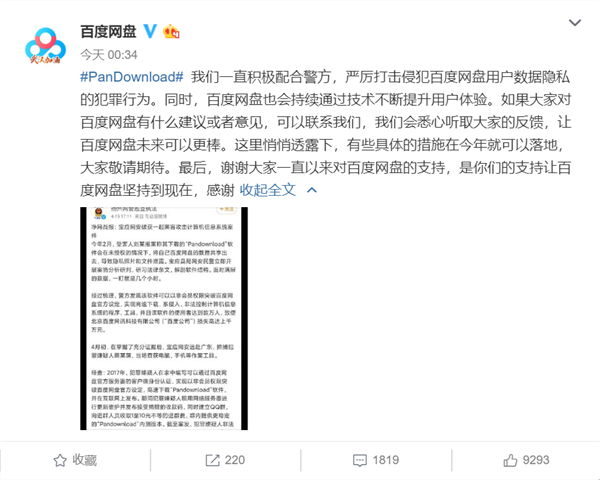 4 月 15 日凌晨,@百度网盘发布消息回应称,一直积极配合警方,严厉打击侵犯百度网盘用户数据隐私的犯罪行为。同时,百度网盘也会持续通过技术不断提升用户体验。