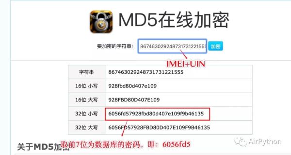 最后,然后将 IMET 和 UIN 组成字符串,然后利用 MD5 进行加密,取 32 位小写的前 7 位即为微信数据库的密码。