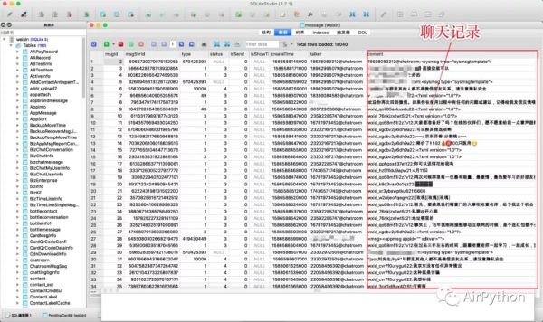 微信所有的文字聊天记录都存放在 mesage 数据表中,包含:聊天内容、发送者、消息类型、创建时间等
