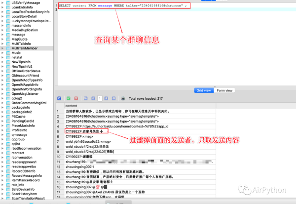 def __get_chartroom_id(self): """ 获取群聊的id :return: """ res = self.db.query('select username from rcontact where nickname=?;', (self.chatroom_name,)) # 群聊id chatroom_id = res[0][0] return chatroom_id第 7 步,获取群聊消息
