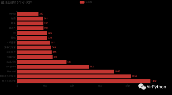 def get_top_partner(self): """ 排名前15的成员 :return: """ sql = "SELECT name as 姓名,COUNT(*) as times FROM top GROUP BY name ORDER BY times DESC limit %d;" % self.top_num result = self.db.query(sql) for item in result: # 用户id id = item[0] # 发言次数 count = item[1] # 获取用户的昵称,即:微信昵称 username = self.get_username(id) self.top_data.append({ 'username': username, 'count': count })最后,去除微信昵称的特殊符号,使用 pyecharts 将数据可视化。