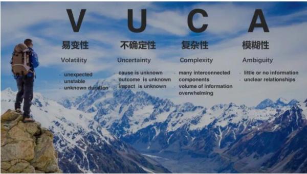 首先,我们引入VUCA这个概念,VUCA是指组织处于一种易变性、不确定性、复杂性、模糊性状态之中。