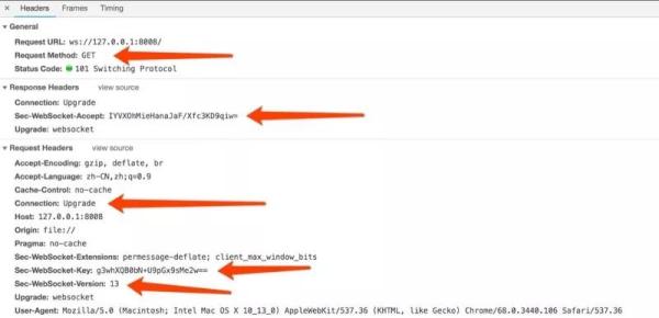 上文中我们提到:在 Javascript 创建了 WebSocket 之后,会有一个 HTTP 请求发送到浏览器以发起连接,然后服务端响应,这就是“握手“的过程。
