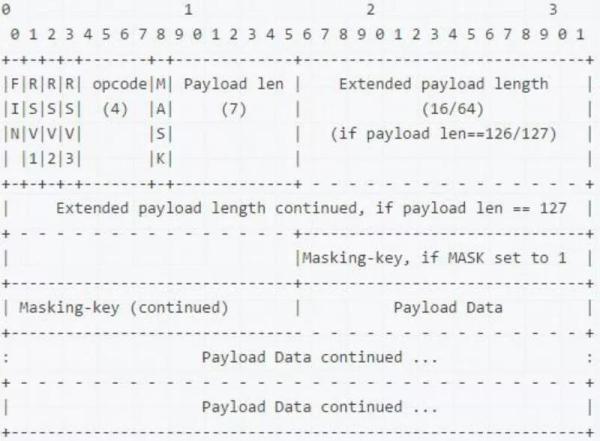 Frame(帧)是 WebSocket 发送数据的基本单位,下边是它的报文格式: