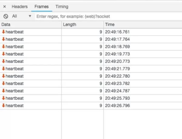 打开客户端浏览器可以看到,Frame 中每秒的心跳数据一直在跳动,当长链接断开之后,心跳就没有了,就像人没有了心跳一样: