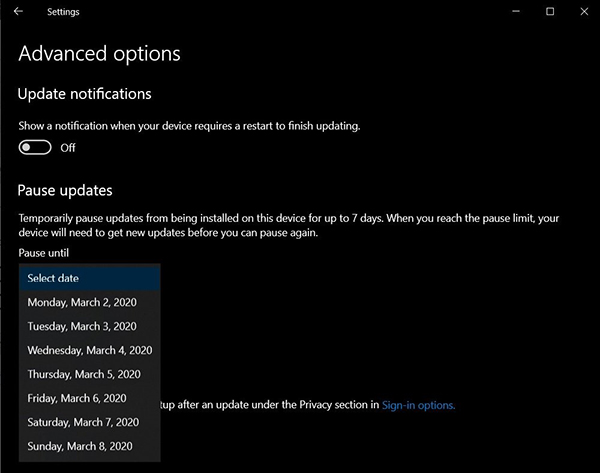 4. 在“暂停更新”部分下,“暂停直到”部分下选择一个日期,防止在该日期之前安装更新。