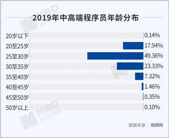 2019年, 20岁~35岁的程序员占比为90.63%;35岁~40岁的程序员占比仅为7.32%,40岁以上的程序员占比更是只有1.91%。