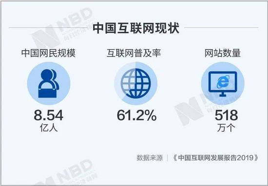 根据《中国互联网发展报告2019》,中国网民规模为8.54亿人,互联网普及率达61.2%,网站数量518万个。