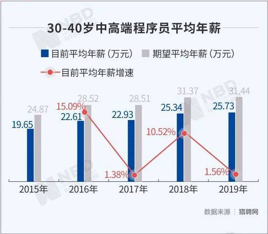 猎聘网数据显示,2018年及2019年,30岁~40岁程序员平均年薪维持在25万元左右,增长迟缓。