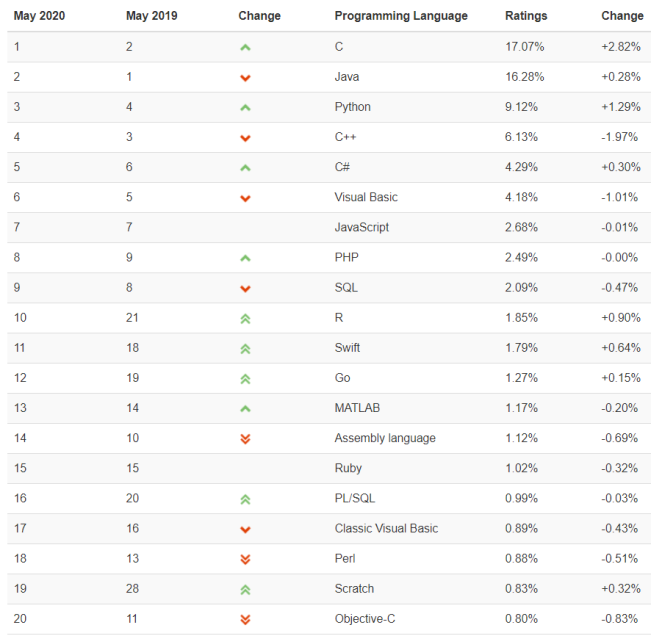 TIOBE公布了5月份编程语言排行榜。相比上个月编程语言Top 5有一个明显的变化就是C语言排行第一了,随后分别是Java、Python、C++、C#。前20名排行如下: