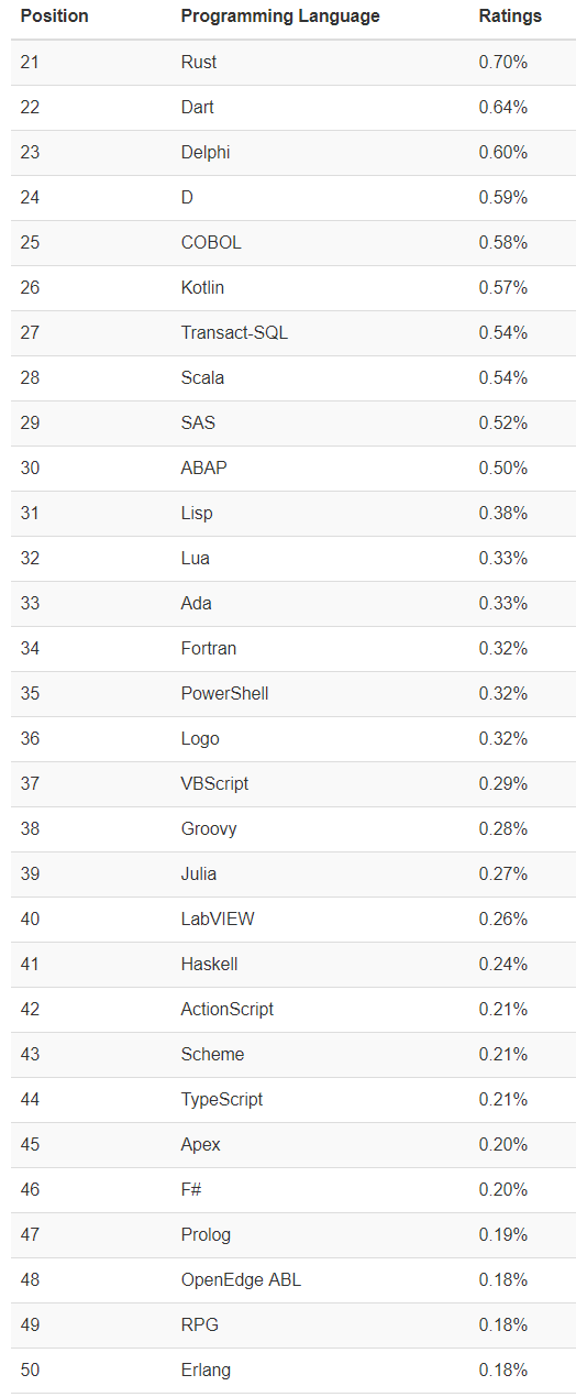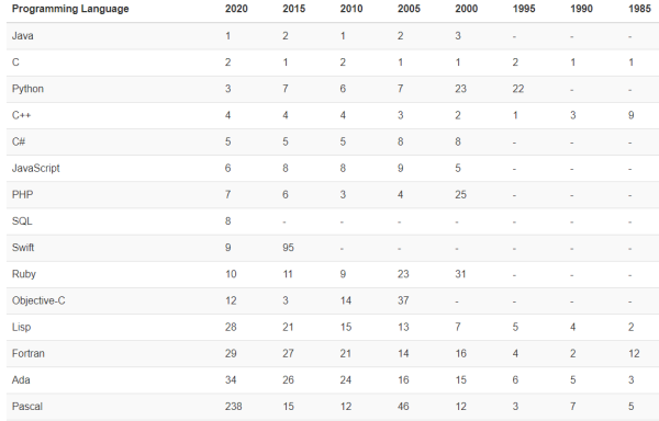 关于这个问题,TOIBE推测可能和COVID-19有关,尽管这听起来有些愚蠢,但某些编程语言确实可以从中受益,还记得前不久,美国州长急聘精通COBOL的程序员的新闻么?还有数据科学领域的Python和R,也在这个阶段大有提升,因为每个人都在通过技术手段寻找治疗该病毒的药物。
