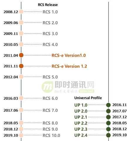 2016年,为了进一步推动RCS的产品开发及全球部署,GSMA推出了RCS Universal Profile(通用配置文件,简称UP,相当于是一个规范标准),并陆续更新了多个版本。目前最新的版本,就是2019年10月发布的Version 2.4。