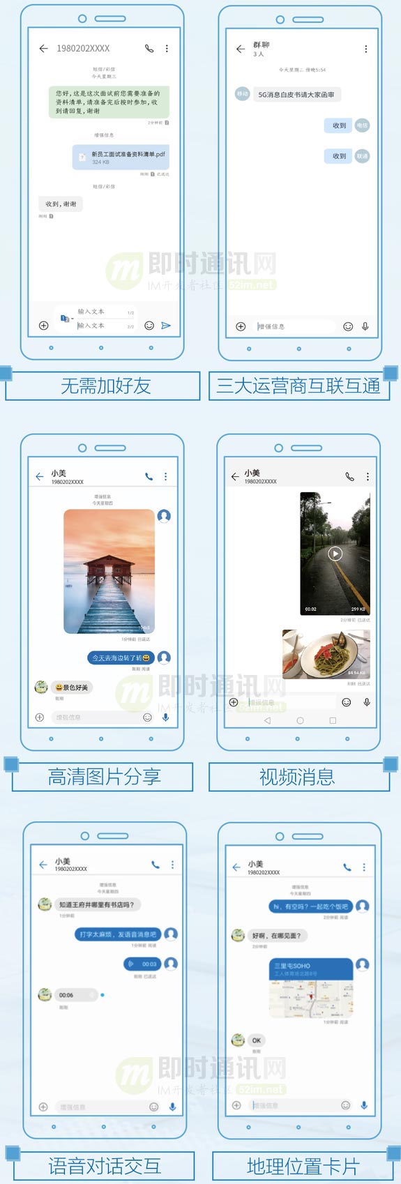针对场景1(即个人用户与个人用户之间的消息交互),RCS支持点对点消息,支持群发、群聊,支持语音、图片、视频多媒体消息,还支持发送位置、名片等,甚至还支持消息云备份和阅后即焚。