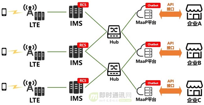 为了实现RCS商业富媒体消息,运营商在自身网络上架设了MaaP能力增强开放平台和Chatbot聊天机器人。平台面向企业开放API接口,以提供服务。
