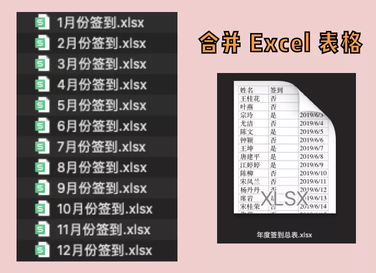 场景二 :你拿到了一堆数据,可能是不同月份的,每个星期的,甚至是每天的,都是一个单独的 Excel 文件,那领导想要看整体的数据表怎么办?比如,12 个月的签到信息合并成一个年度签到总表.xlsx 。