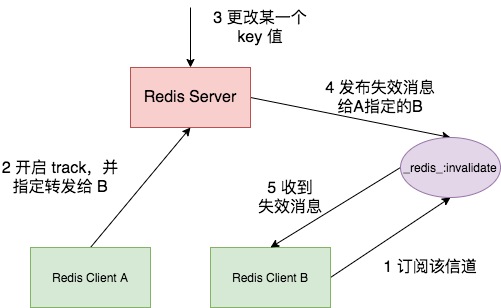 上述操作时客户端都需要先开启 RESP3,Redis 为了兼容 RESP2 协议提供了转发(Redirect)模式,不再使用 RESP3 原生支持 PUSH 消息,而是将消息通过 Pub/Sub 通知给另外一个客户端,具体流程如下图所示: