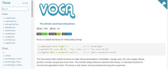 Voca是一个用于处理字符串的JavaScript库。 Voca库提供有用的功能来使字符串操作舒适:更改大小写,修饰,填充,弹化,拉丁化,sprintfy,截断,转义等等。 模块化设计使我们可以加载整个库,或仅加载单个功能以最小化应用程序构建。 该库已经过全面测试,有据可查,并得到长期支持。