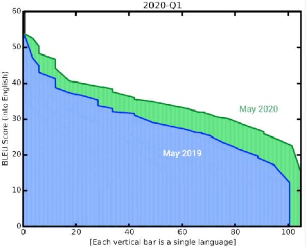 谷歌表示,其翻译质量的突破并不是由单一技术推动,而是针对资源较少的语言、高质量源语言、总体质量、延迟和整体推理速度的技术组合。在2019年5月至2020年5月之间,通过人工评估和BLEU(一种基于系统翻译与人工参考翻译之间相似性的指标)进行衡量,谷歌翻译在所有语言中平均提高了5分或更多,在50种最低水平的翻译中平均提高了7分或更多。此外,谷歌表示,“翻译”对机器翻译联想的功能变得更加强大,一种现象是,当给泰卢固语字符“షషషషషష”输入,“Shenzhen Shenzhen Shaw International Airport (SSH)”)时,AI模型会产生奇怪的翻译“Sh sh sh sh sh sh sh sh sh sh sh sh sh sh sh sh sh”。