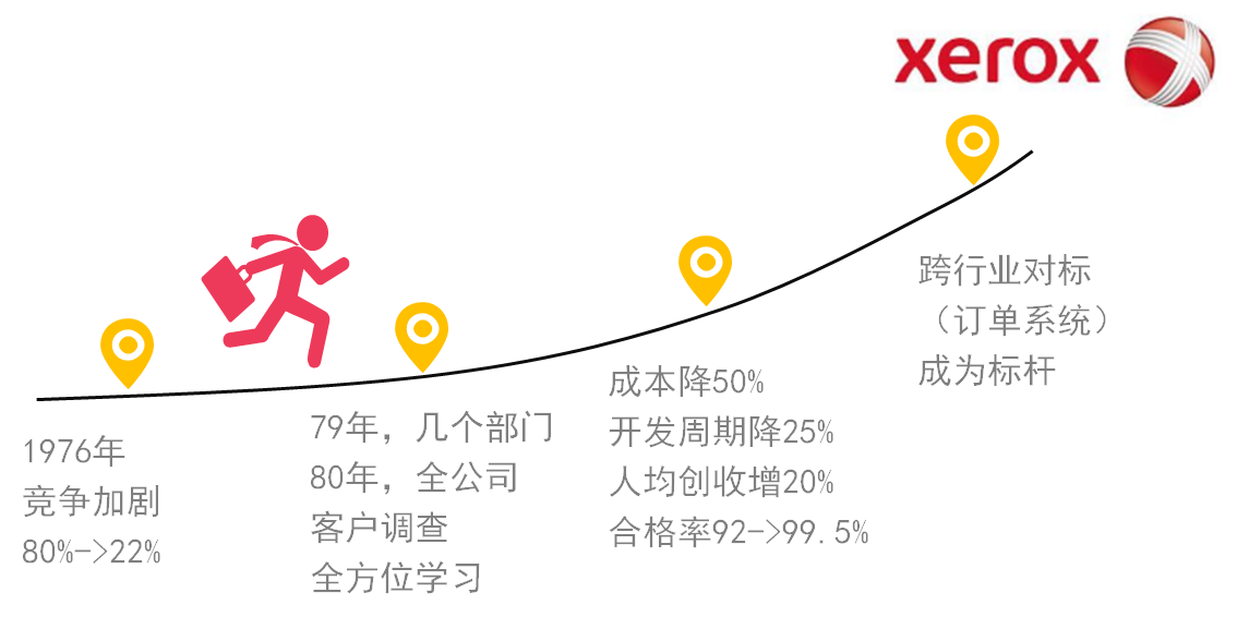 施乐是一家有强烈创新和危机意识的公司,是静电复印技术的领先者,甚至可以说是静电复印的代名词,一度占据着80%以上的市场份额。但在1976年前后,一直保持着世界复印机市场实际垄断地位的施乐公司受到了来自国外,特别是日本竞争者的挑战,如佳能、NEC等,这些公司以低于施乐的生产成本销售复印设备并仍能获利,他们的产品开发周期只有施乐的50%,开发人员则只有施乐的50%。施乐的市场占有率在几年内就锐减到了22%,市场份额被竞争对手蚕食,面对威胁,施乐公司发起向日本企业学习的运动,开展了广泛、深入的标杆管理。