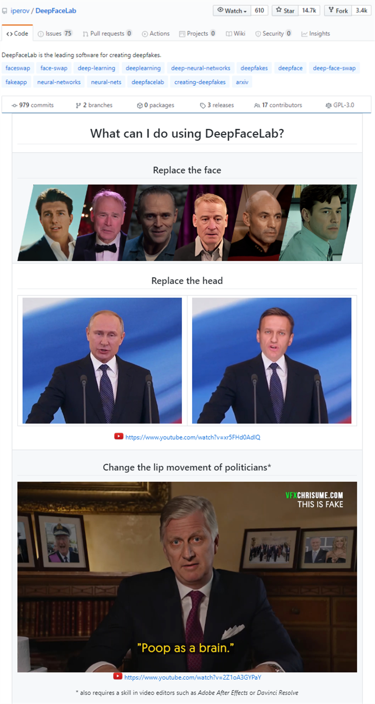关注度在一定程度上反映了其热度。日前,GitHub 上一个集成各类 deepfake 功能的仓库DeepFaceLab 登上热榜。DeepFaceLab 的介绍中赫然写着:DeepFaceLab 可以用来换脸,和改变政客们的言论。截至目前,DeepFaceLab 已有14.7K Star。