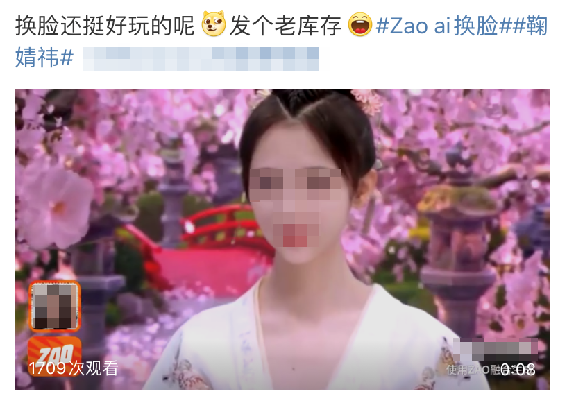 (微博用户使用 ZAO AI 换脸鞠婧祎影视作品人物形象视频)