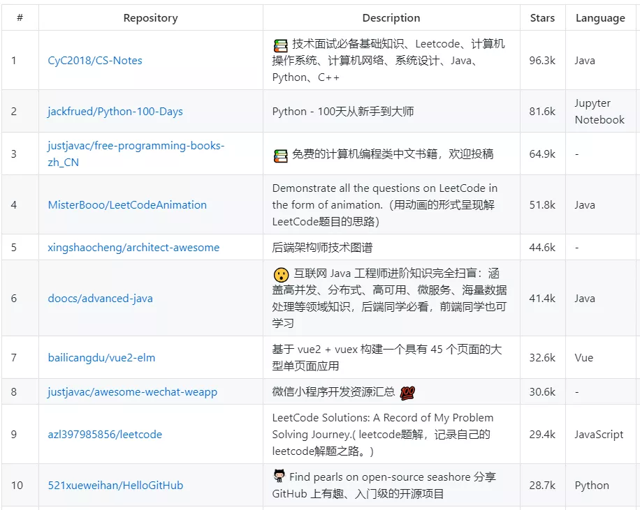 Github优秀中文项目汇总。涵盖Java、C/C++、Python、Ruby等编程语言。