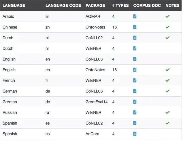 对于斯坦福 NLP 库,我们一定不会陌生,stanza是斯坦福开源的Python版工具包,该库有 60 多种语言的模型,可进行命名实体识别等 NLP 任务。除了语言模型外,Stanza 还支持了数十种语言的敏敏实体识别模型。完整列表如下: