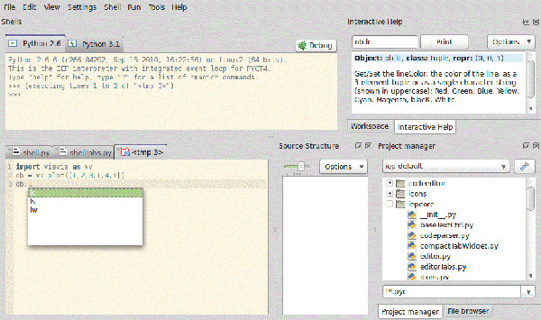 它由编辑器、外壳、各种实用的标准工具(比如文件浏览器、源结构和日志记录器)以及从诸多方面帮助程序员的交互式帮助功能组成。它在编辑器和外壳中都提供全面的Unicode支持。您可以选择不同的Qt主题。