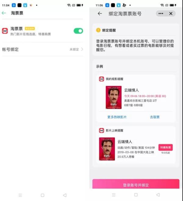 触发场景:用户在淘票票快应用中购票之后,在影片上映前的固定时间内触发该卡片内容展示,进而提醒用户取票,即消息触发场景。