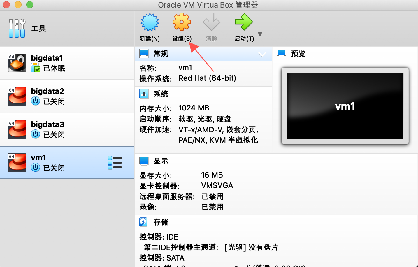 到这里,虚拟机就创建好了,接下来要为虚拟机提供系统的启动镜像,选中虚拟机,点击设置: