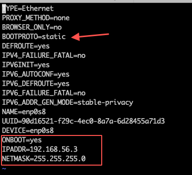 首先要把网络从 dhcp 自动获取 ip 改成 static,再同样设置 ONBOOT 为 yes,IPADDR 指定这台虚拟机的固定 IP,IP 可以随意设置,但是要在这个网段内,NETMASK 配置的是这个网络的网络掩码。