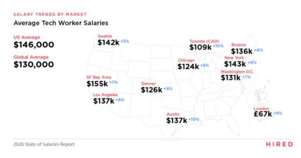 旧金山湾区仍然是技术行业薪资最高的地区,平均薪资为 155k 美元,相比于去年增长了 7%。
