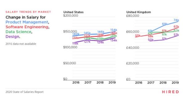 Hired 分析了产品经理、软件工程师、设计师以及数据科学家这些职位的薪资之后,发现去年美国和英国这些职位的薪资水平均有所增长。