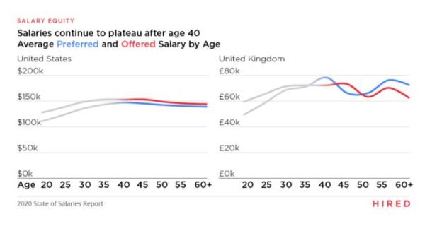 除了不同族裔的人群存在薪资差异,年龄也对技术人才的薪资产生影响。该报告显示,45 岁以上员工的薪资将停滞不前,甚至下降。