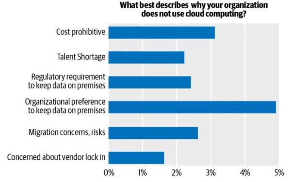 我们针对没有采用云计算的受访者也做了详细的调查,发现不采用的最大原因是企业选择将数据保留在本地,3% 的受访者表示是风险问题,尤其是将本地工作负载、服务、数据迁移到云,2% 的受访者表示会担心监管问题,还有不到 2% 的受访者表示担心厂商锁定问题。