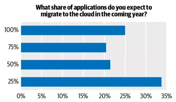 比较奇怪的是,大部分受访者的上云节奏都比较极端:约有 34% 的受访者表示希望在未来一年内将应用程序的四分之一迁移上云,而 25% 的受访者则希望在未来一年内将所有应用程序都迁移上云。