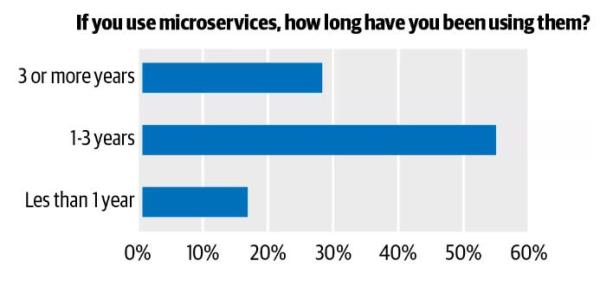 根据调查结果显示,52% 的受访者表示他们已经在软件开发中使用了微服务的概念、工具或方法。其中,超过 55% 的公司已经使用微服务 1-3 的时间,28% 已经使用微服务超过 3 年,另外 17% 受访者是微服务新手,使用不到 1 年。