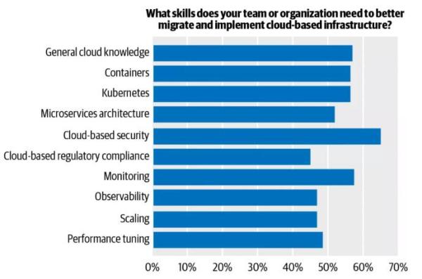 针对迁移或实施基于云的基础架构来说,什么样的技能是最关键的呢?根据调查结果显示,排在第一位的是云安全性(65%),排在第二位的是监控(58%)。受访者还认为以下这些技能是必备的:通用云知识、容器、Kubernetes、微服务架构等等。