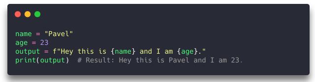 只需将小写或大写字母“f”放在字符串前面,将变量或表达式放在大括号内。