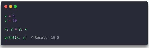 在许多其他编程语言中,只能通过定义附加的temp(临时)变量来交换两个或多个变量的值。