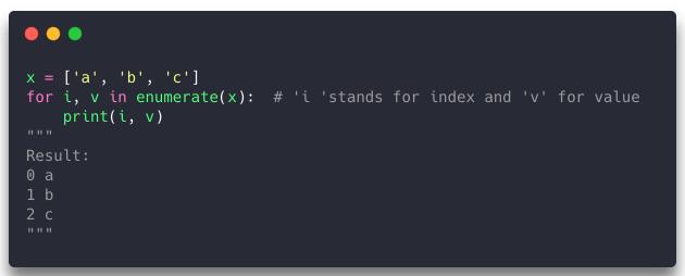 你可以将变量i和v更改为您可能喜欢的变量名。例如,对于索引,在枚举(x)中计数。