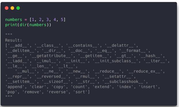 dir()通常用于调试目的。dir()能够列出传递的参数的所有属性,在分别处理许多类和函数时非常有用。