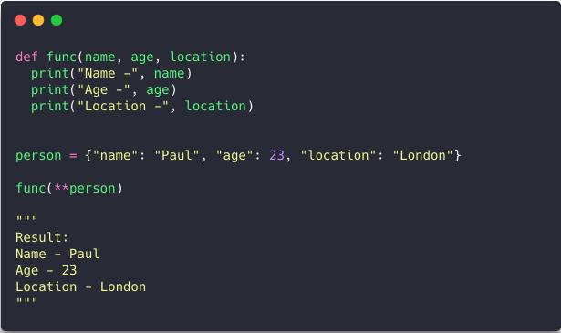person = {"name": "Paul", "age": 23, "location": "London"}你可以使用**运算符将字典传递给函数。
