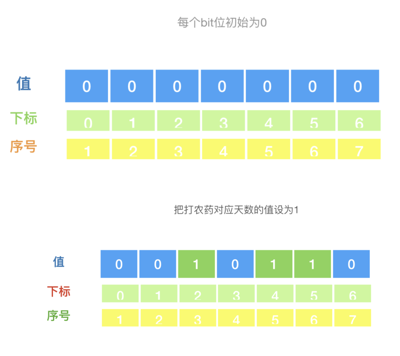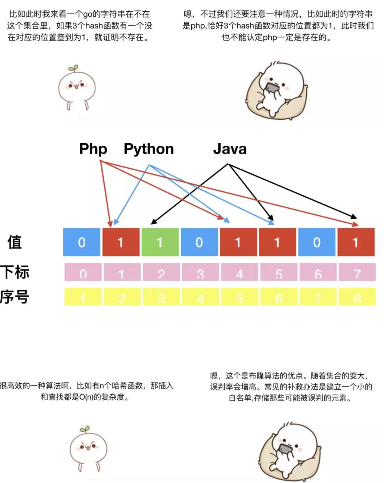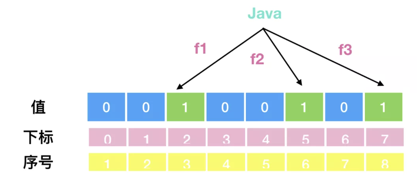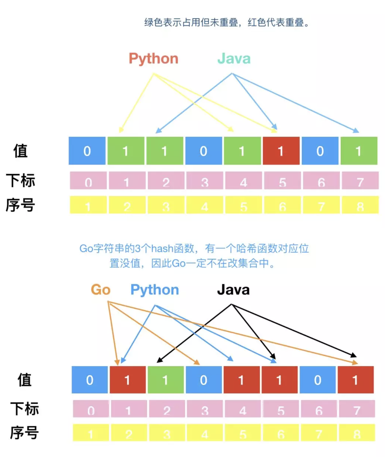 ps:f1,f2,f3代表3个不同的hash函数。箭头指向的地方代表通过hash函数计算出的hash值同时也是在位图中的位置。